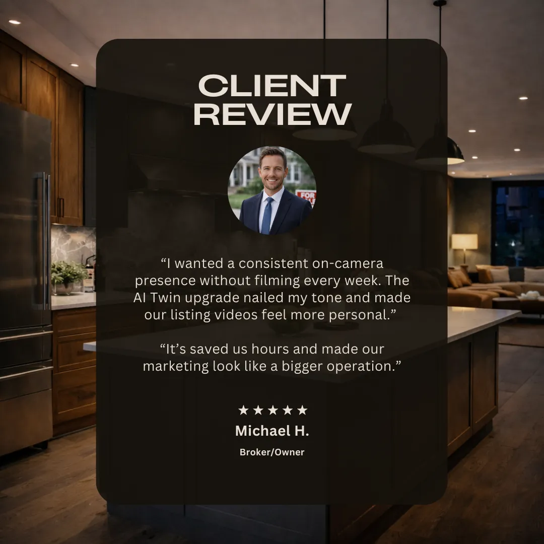 No. Our AI presenters and AI Twins are used only with client approval and for marketing content. We also follow basic safeguards to reduce fraud risk (e.g., verified client consent and controlled usage). Real estate organizations have warned that deepfakes can be used for impersonation and wire fraud, so we take identity and content controls seriously.